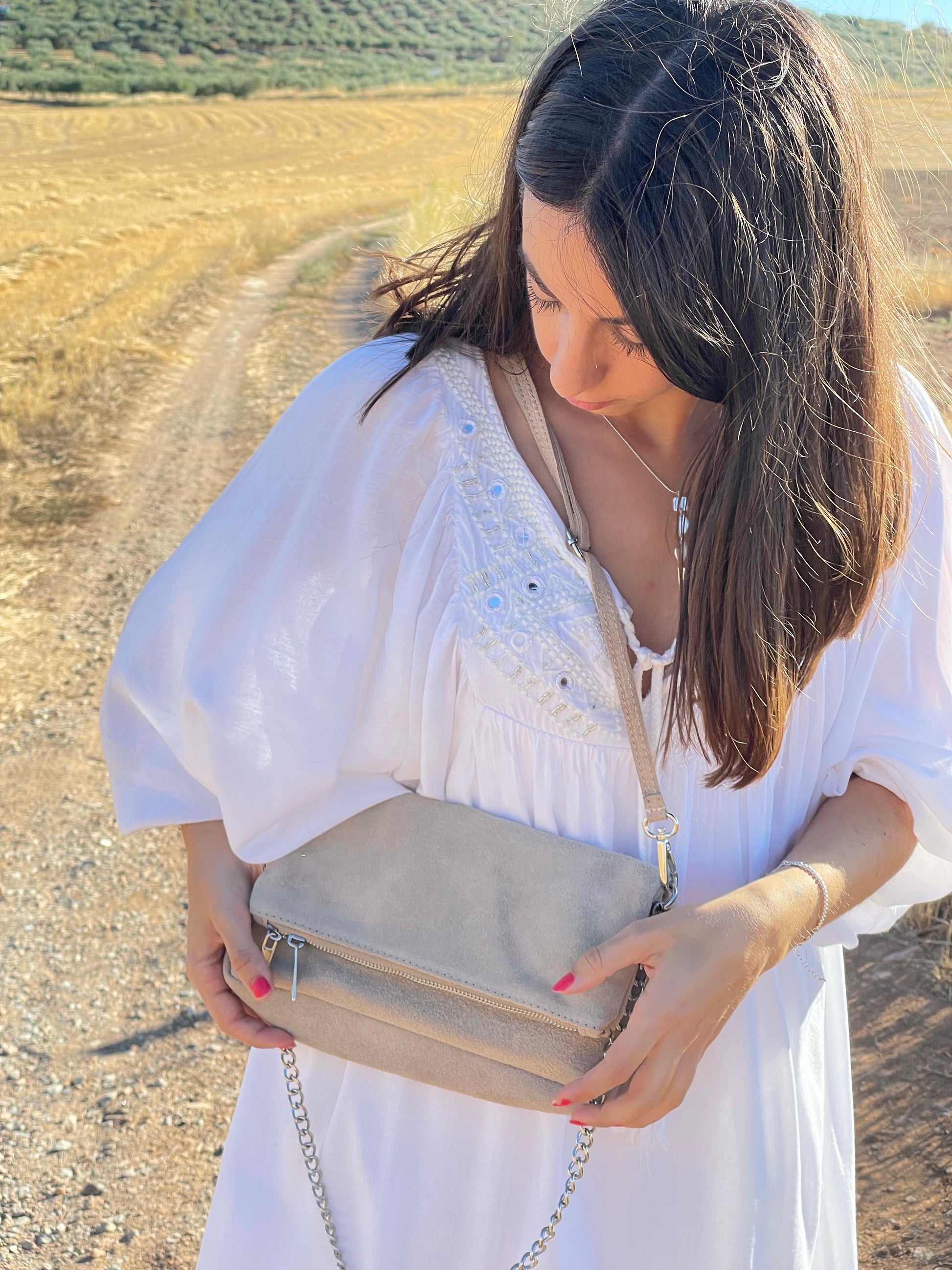 Bolso bandolera rectangular de piel de ante. Tamaño mediano. Interior forrado. Cierre mediante cremallera e imán en la solapa. Asa corta de cadena y asa larga en piel para llevar cruzado. Dispone de un bolsillo trasero con cierre en cremallera.