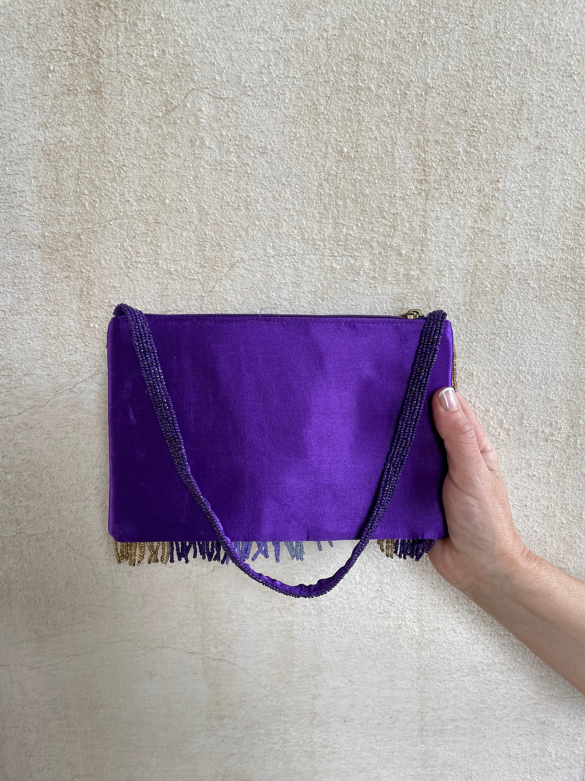 Bolso confeccionado en tela. Interior forrado. Cierre en cremallera. Asa de mano. Detalles de cuentas y abalorios en la parte delantera.