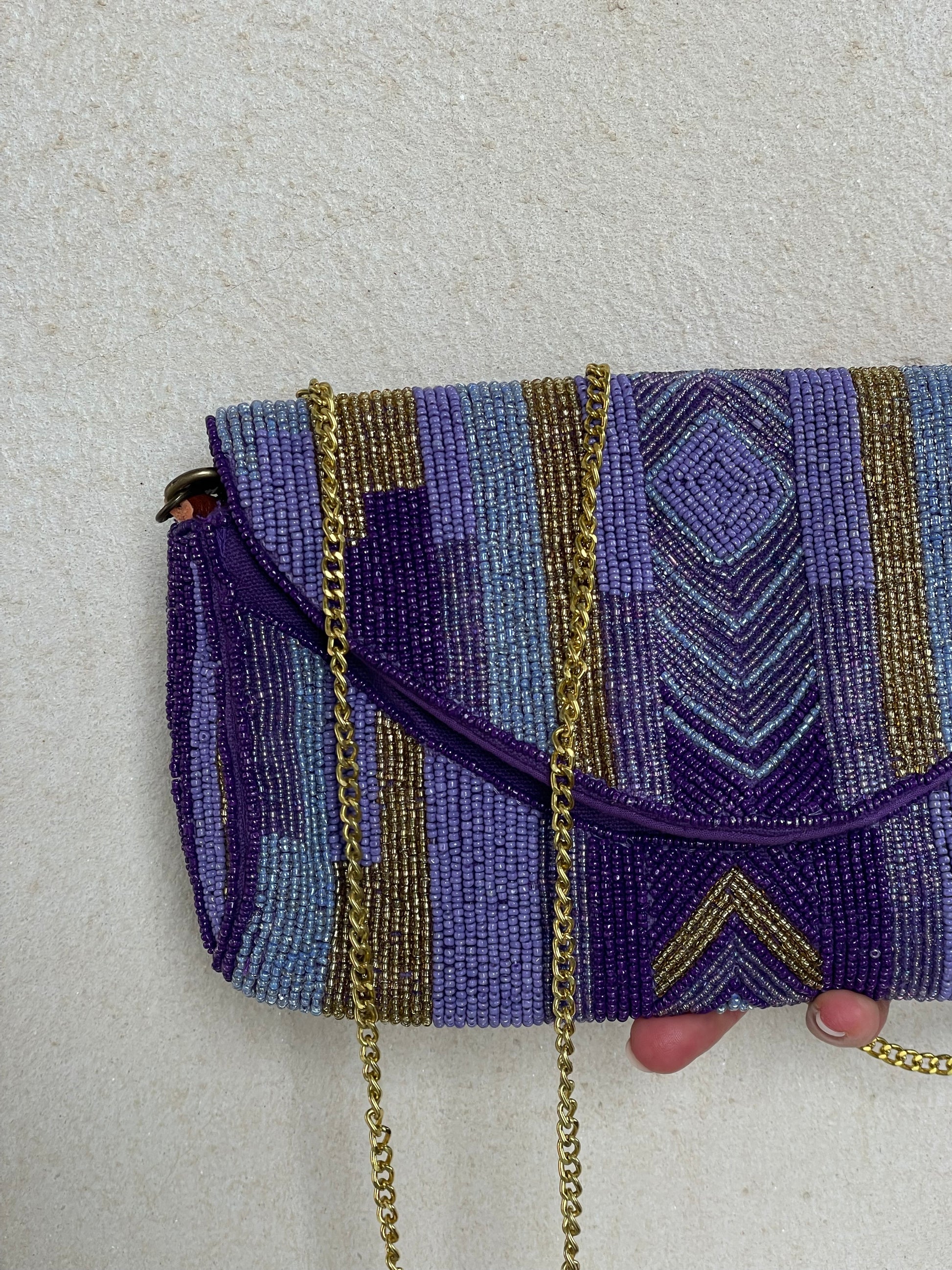 Bolso confeccionado en tela. Interior forrado. Cierre en imán. Asa de cadena para llevar en mano y cadena larga para llevar cruzado. Decorado en perdería y lentejuelas.