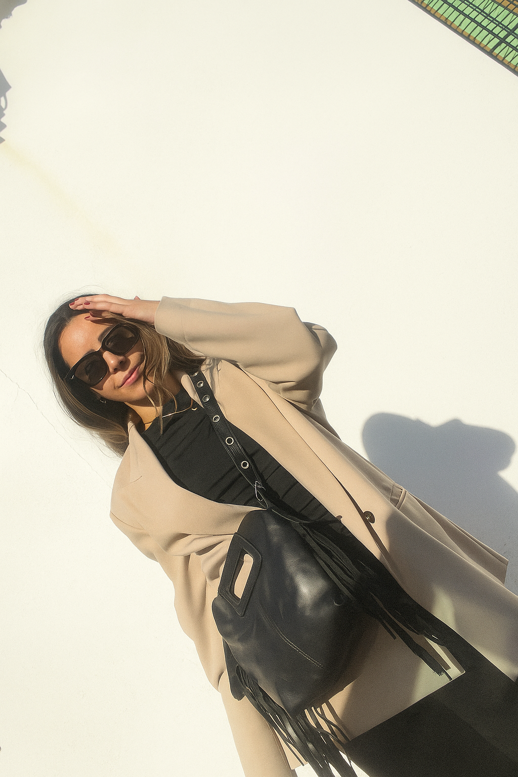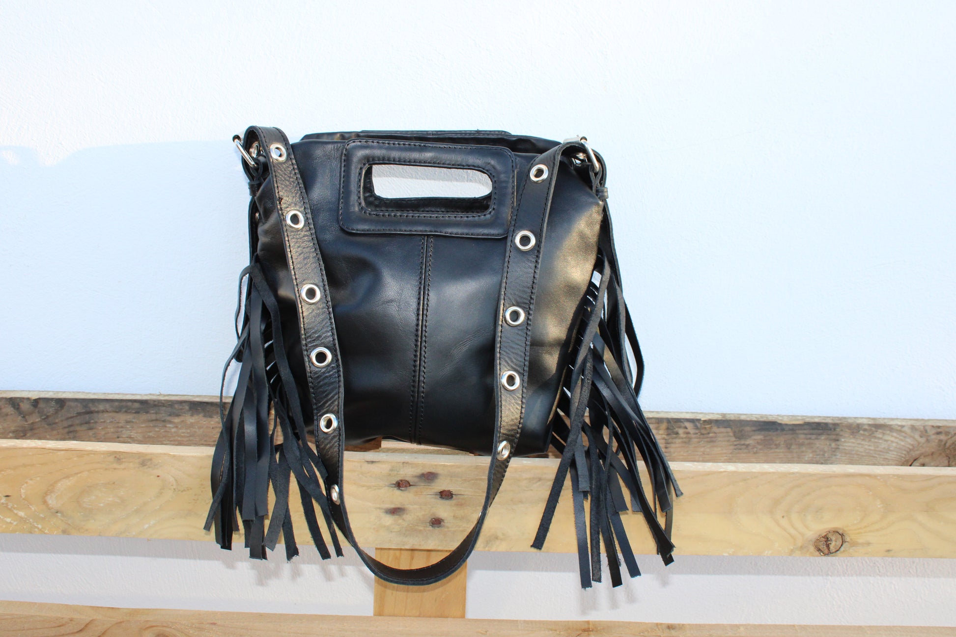 Bolso bandolera de piel. Tamaño mediano. Forro y bolsillo interior. Costura marcada en el centro. Asas ajustables con ojales metálicos. Flecos laterales.