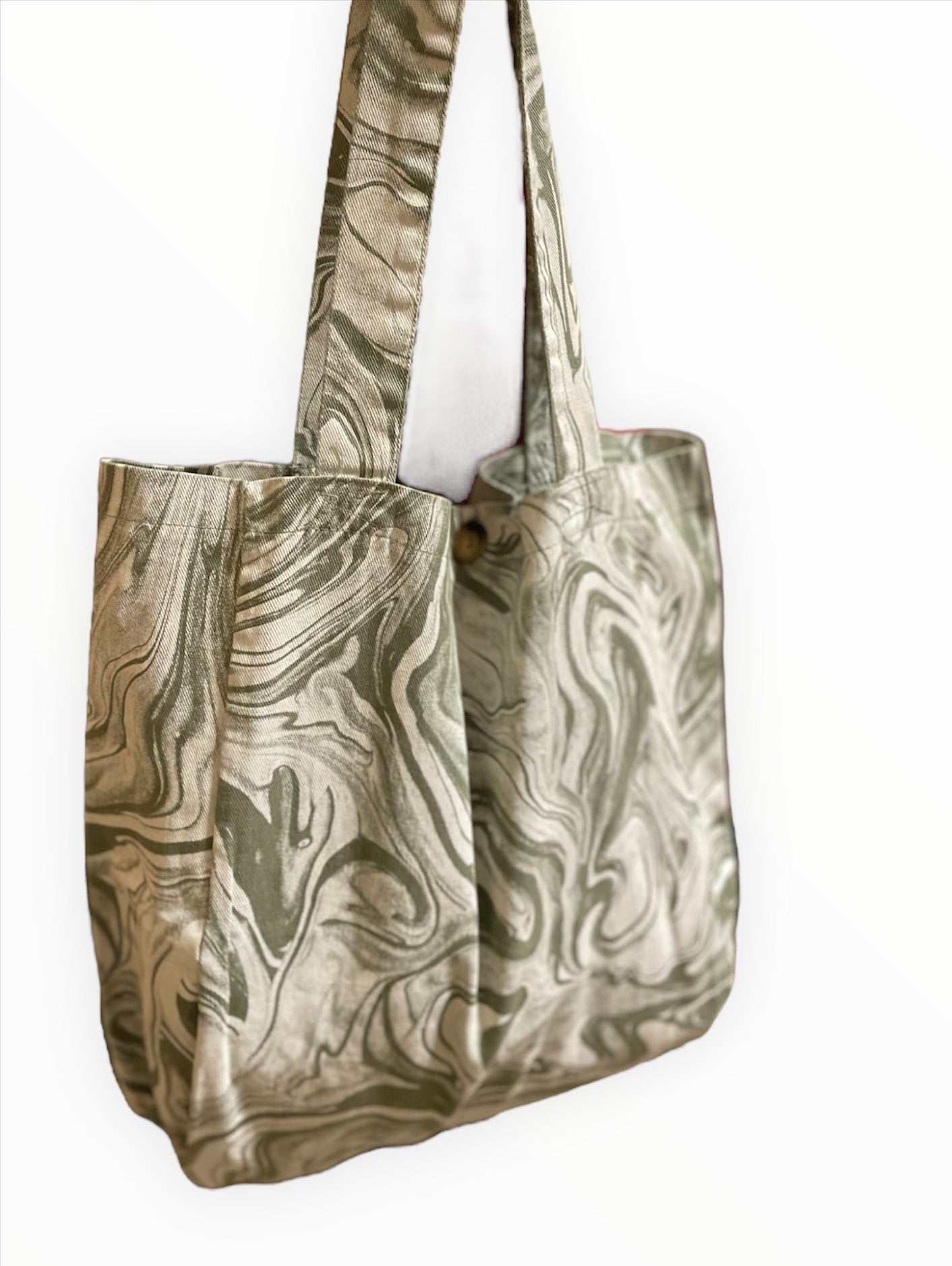 Bolso shopper estampado. Tejido de algodón. Bolsillo interior. Cierre con botón.