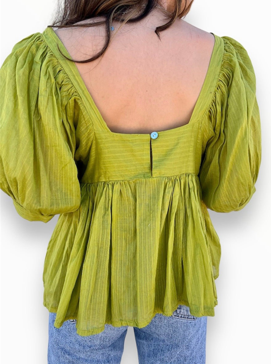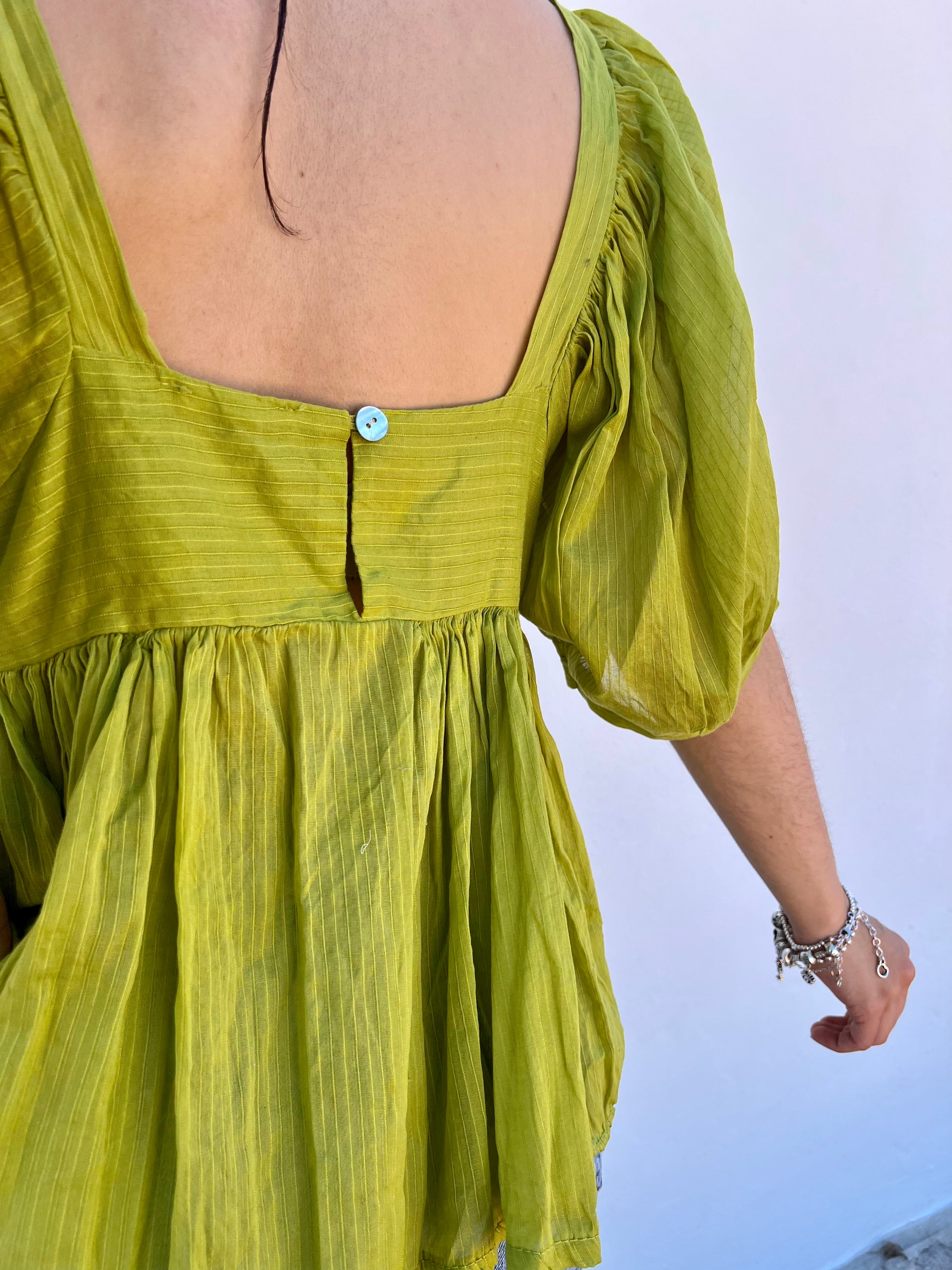 Blusa confeccionada en algodón. Cuello cuadrado y manga corta abullonada acabada en puño. Corte fruncido bajo el pecho. Cierre trasero con botón.