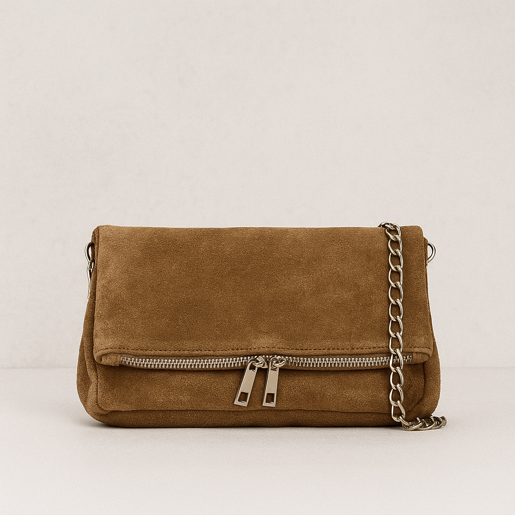 Bolso bandolera rectangular de piel de ante. Tamaño mediano. Interior forrado. Cierre mediante cremallera e imán en la solapa. Asa corta de cadena y asa larga en piel para llevar cruzado. Dispone de un bolsillo trasero con cierre en cremallera.