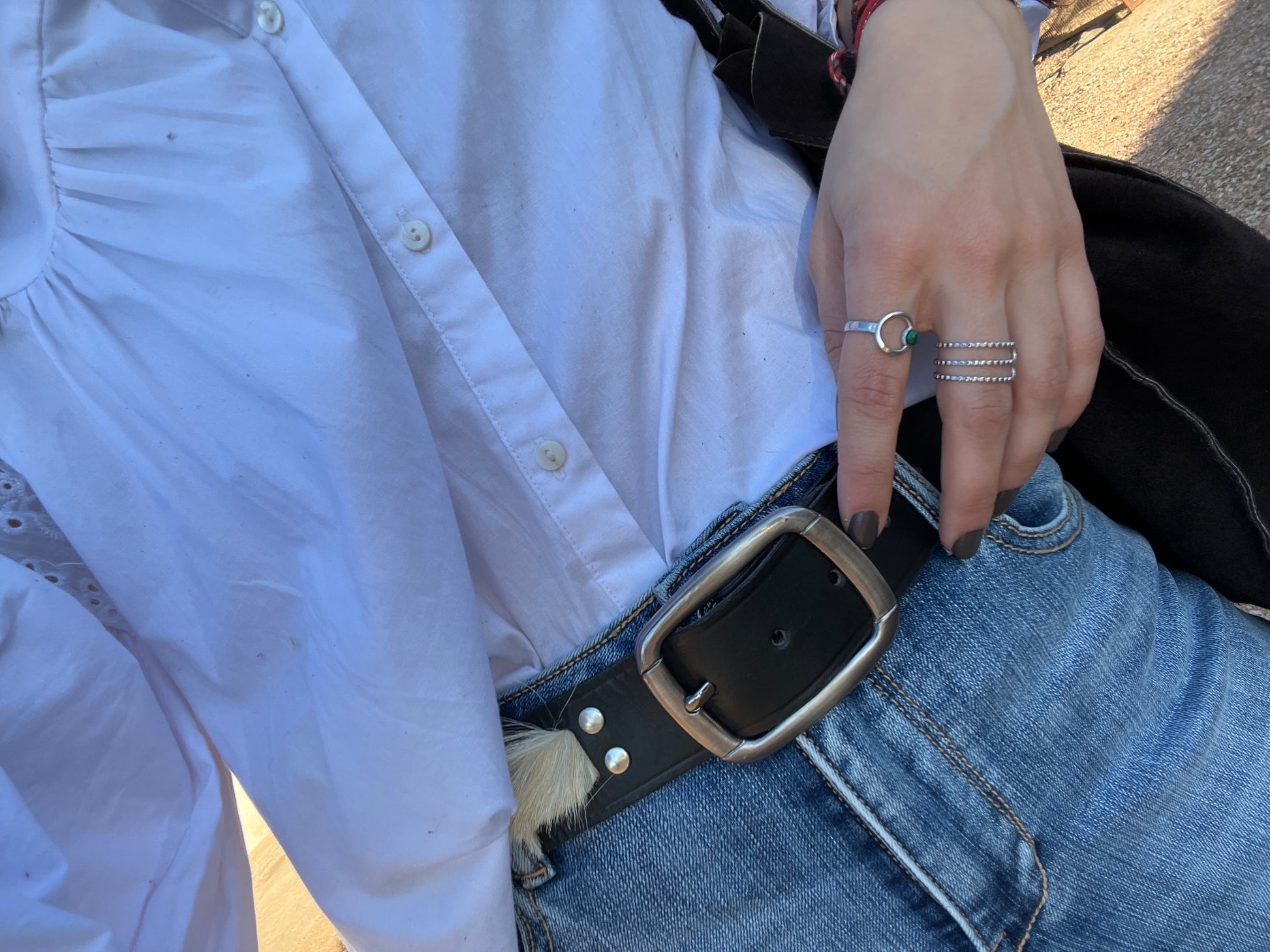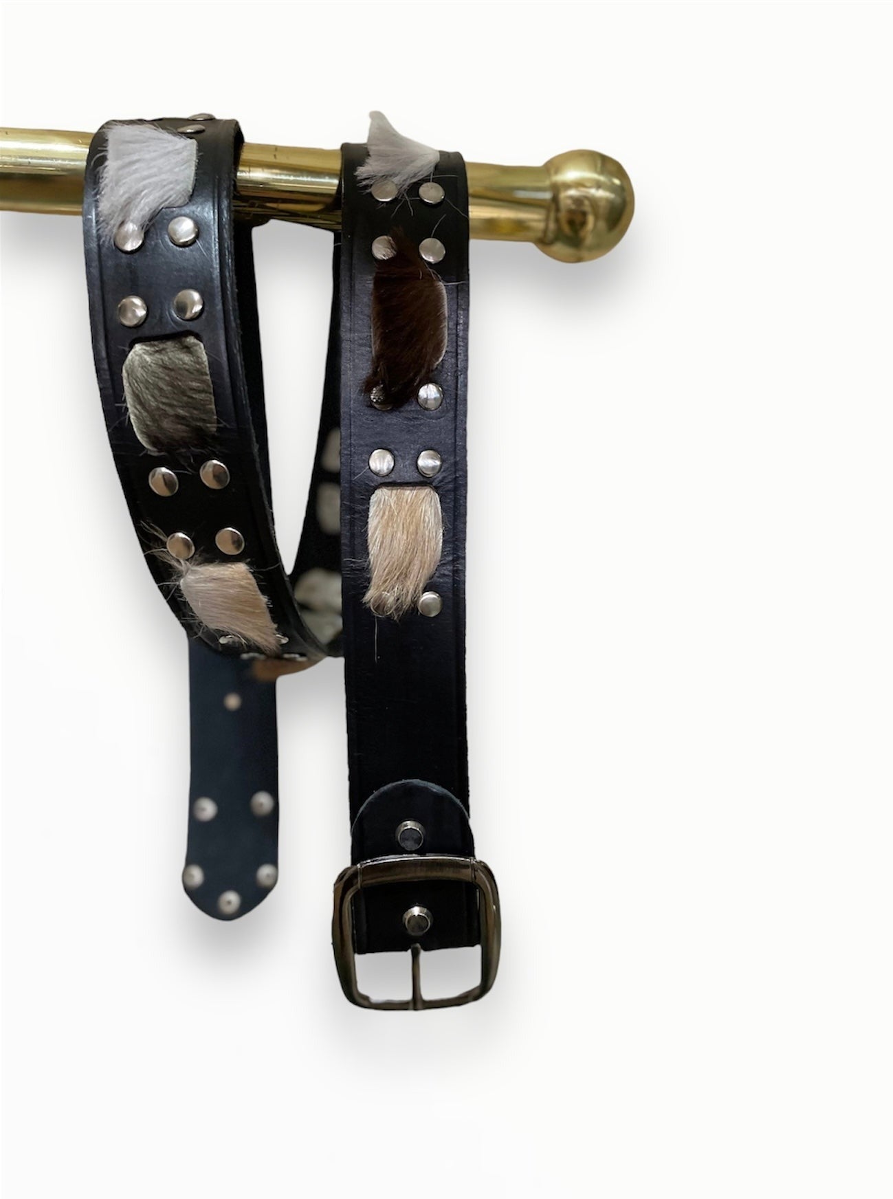 Cinturón de piel negra con detalle de pelo y tachas en plateado. Hebilla metálica plateada.
