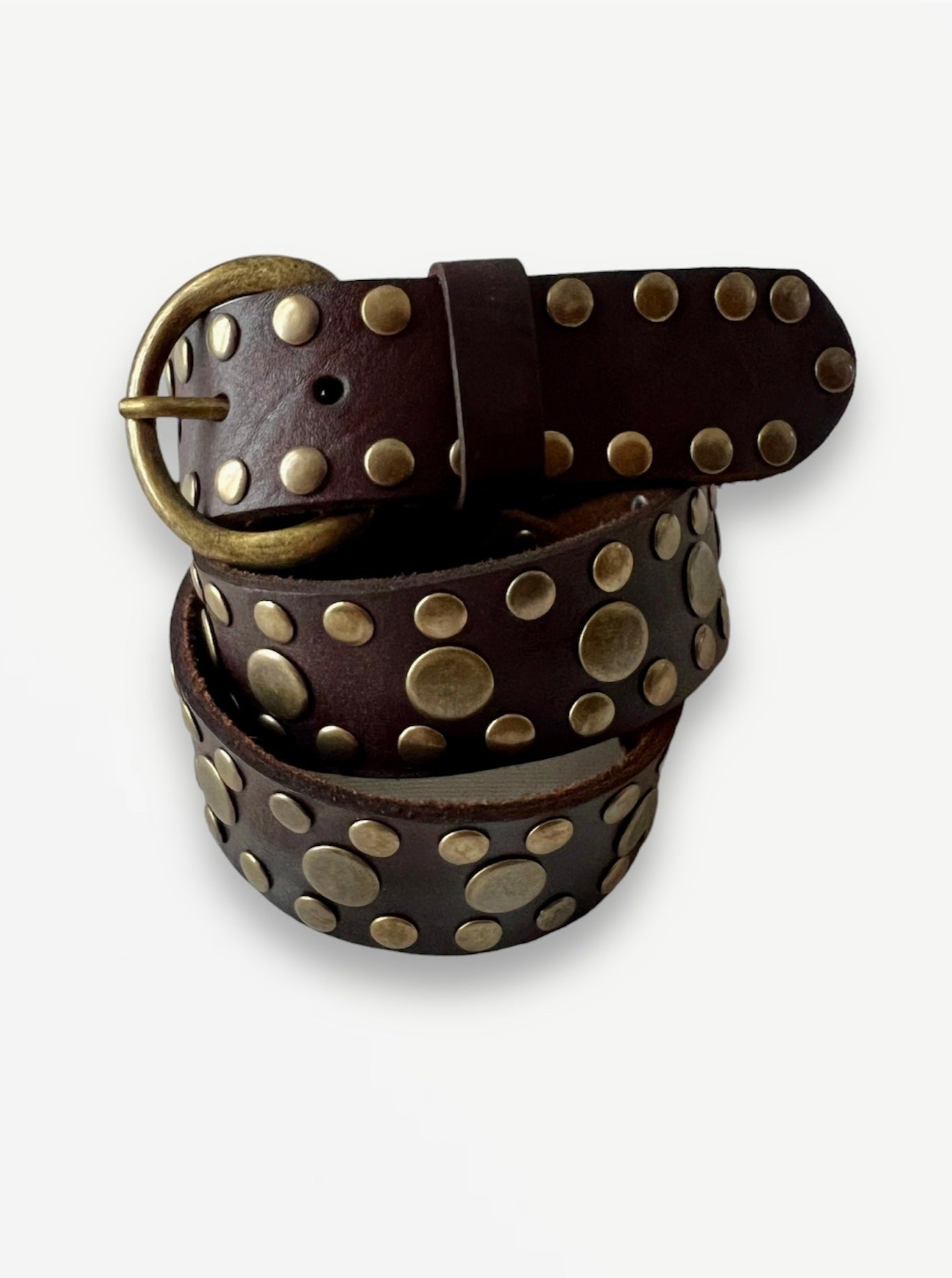 Cinturón de piel marrón con detalle de tachas en oro viejo. Hebilla metálica oro viejo.