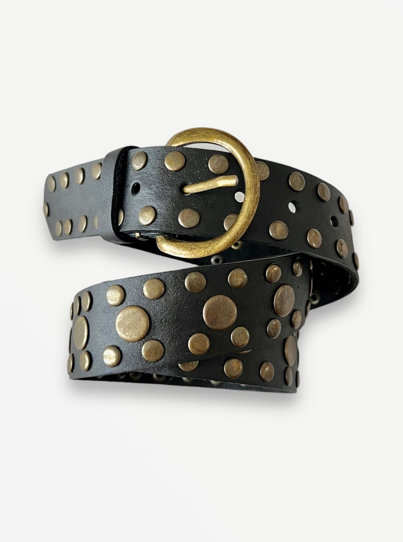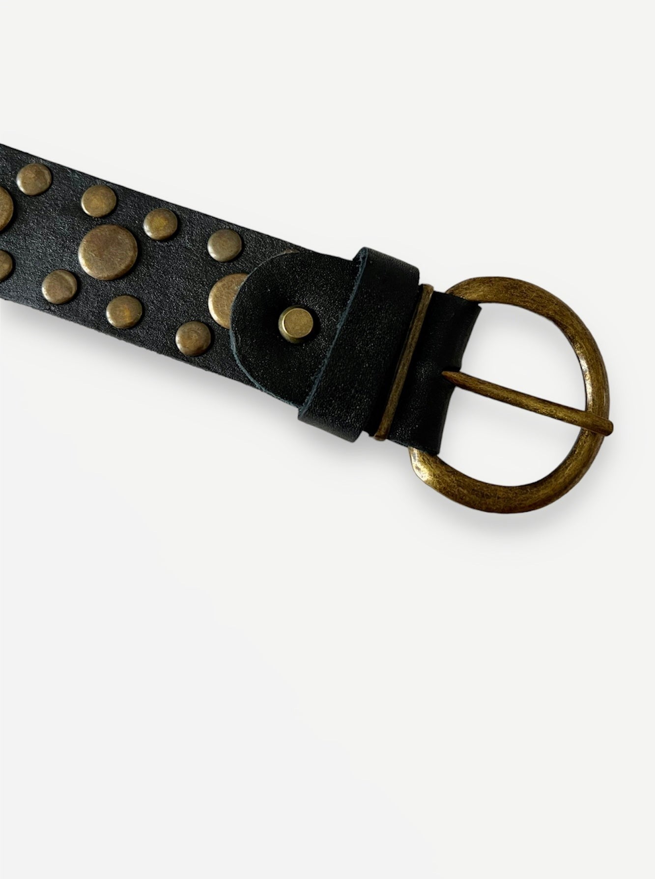 Cinturón de piel negra con detalle de tachas en oro viejo. Hebilla metálica oro viejo.