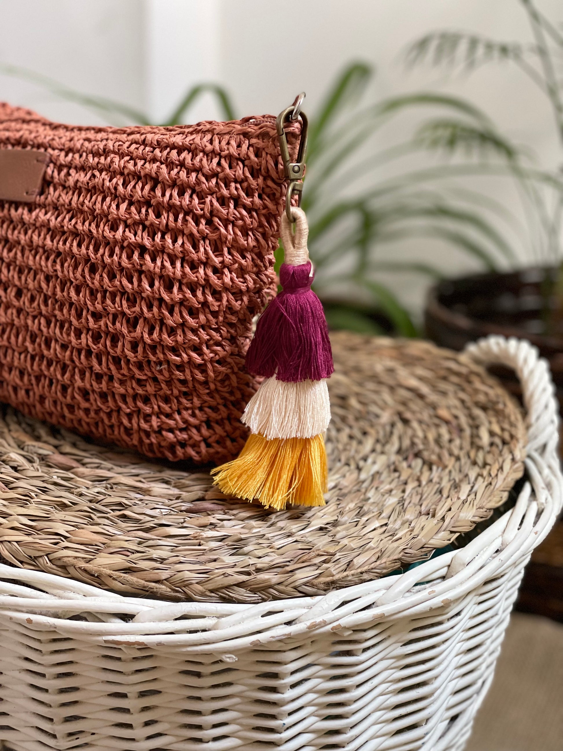 Llavero colgante de pompones de hilo y carey. Enganche dorado.
