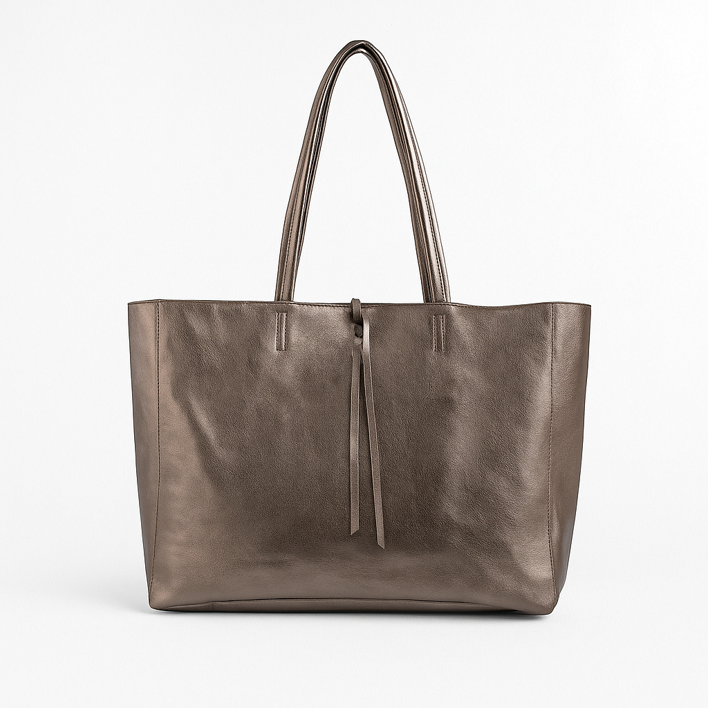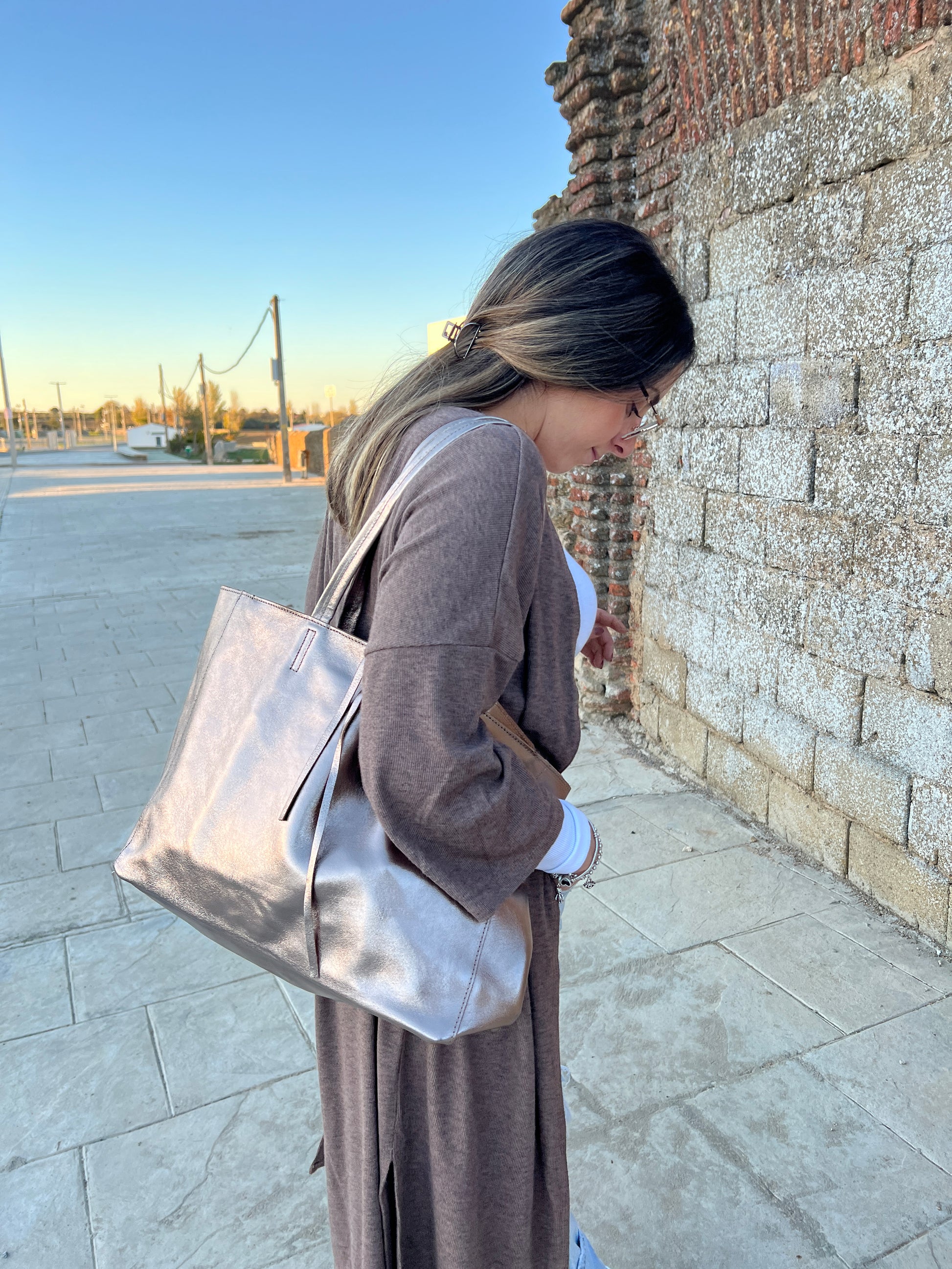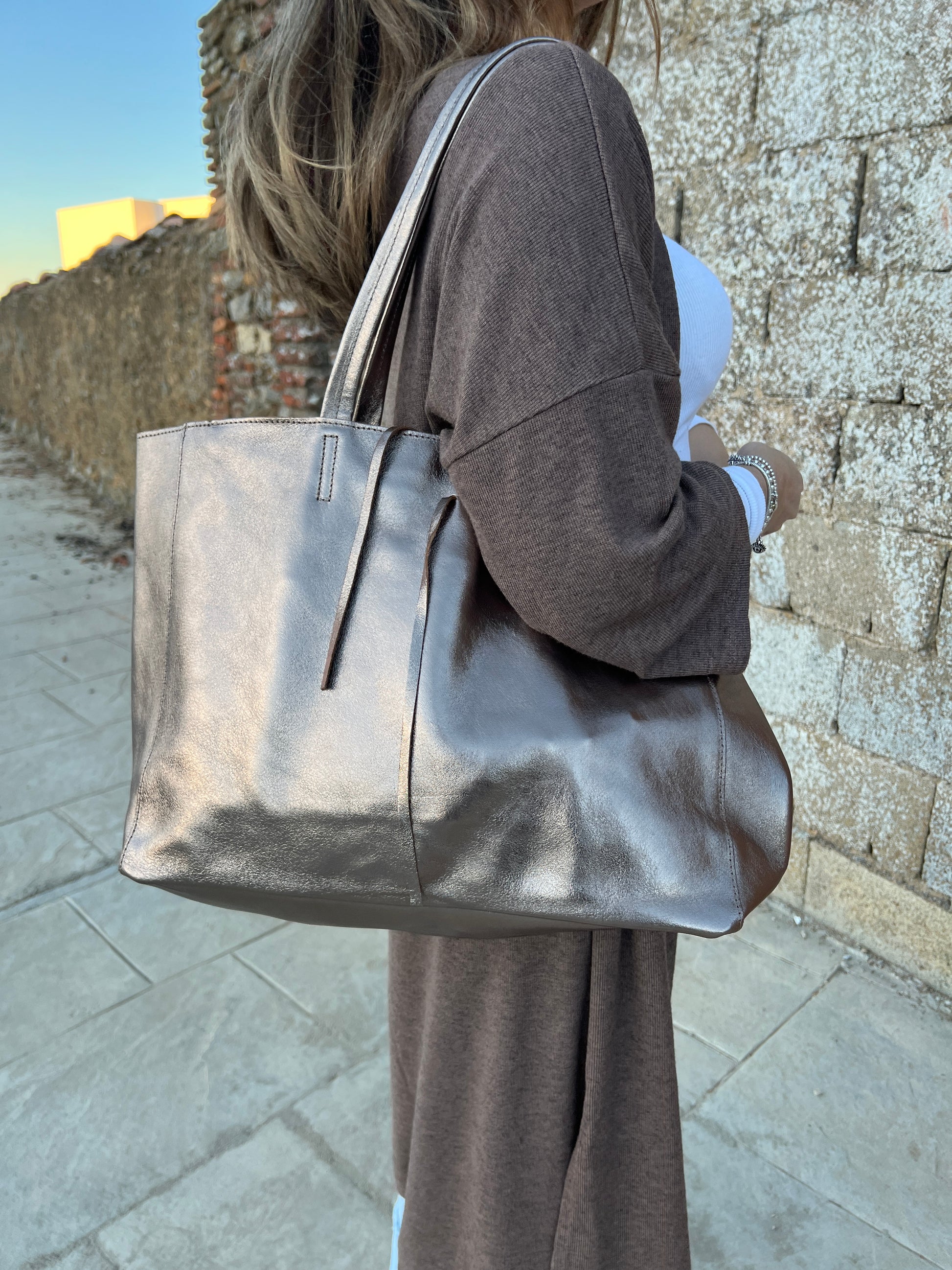 Bolso de hombro de piel. Tamaño grande. Interior sin forrar. Bolsillo interior con cremallera. Cierre mediante lazo. Asas fijas para llevar al hombro.