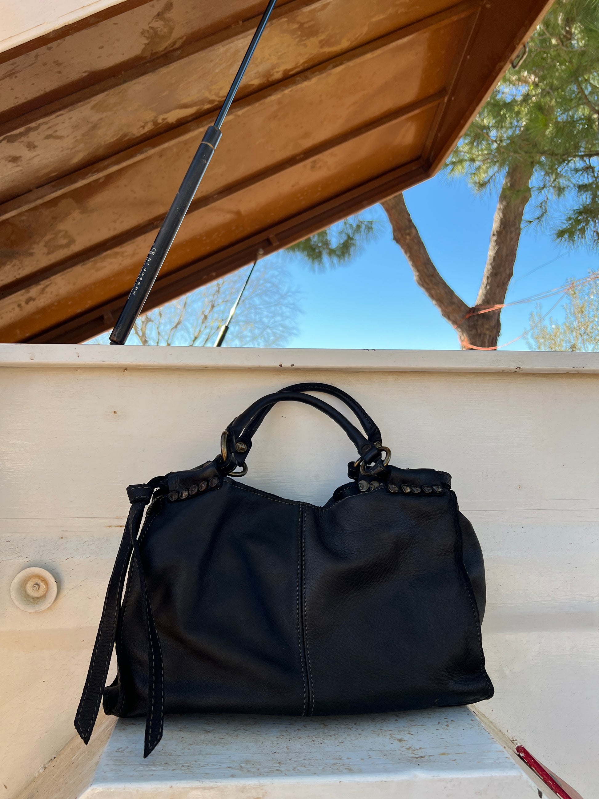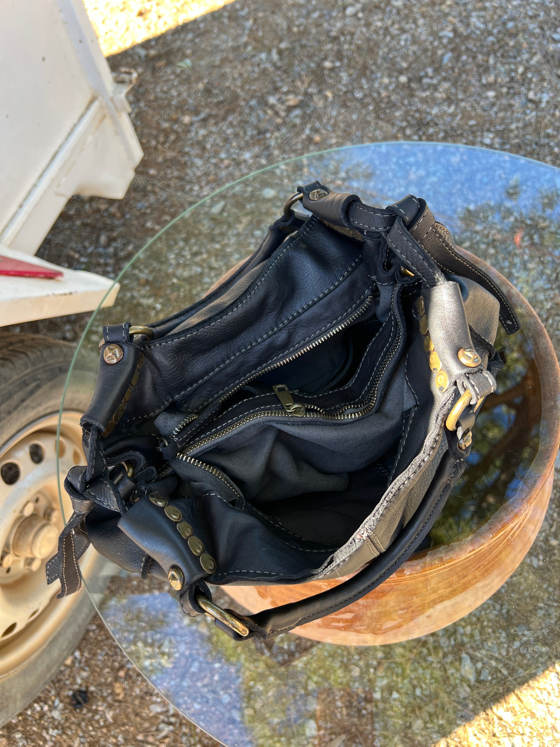 Bolso de hombro de piel con tachuelas. Tamaño grande. Costura marcada en el centro. Cierre mediante cremallera.