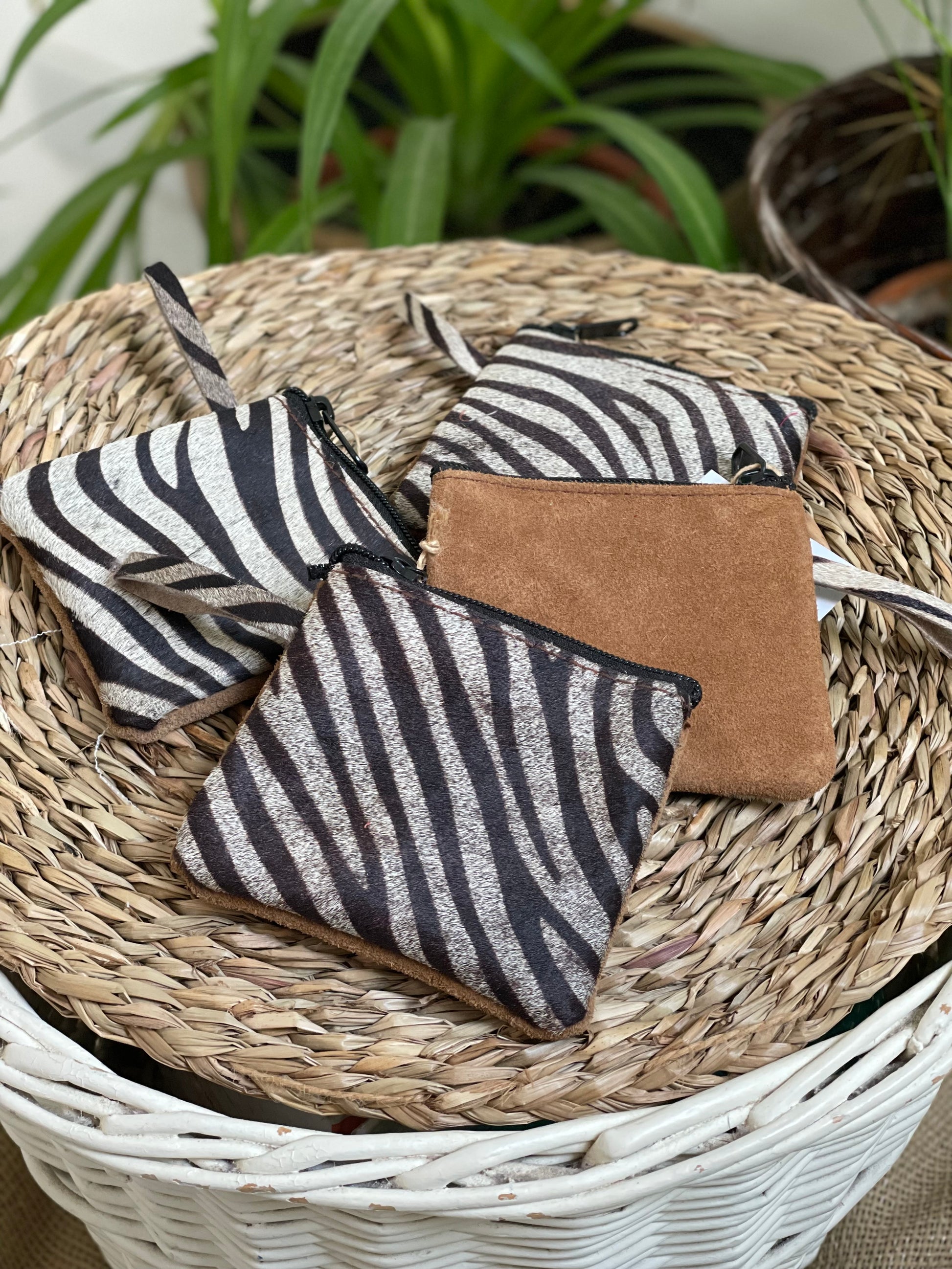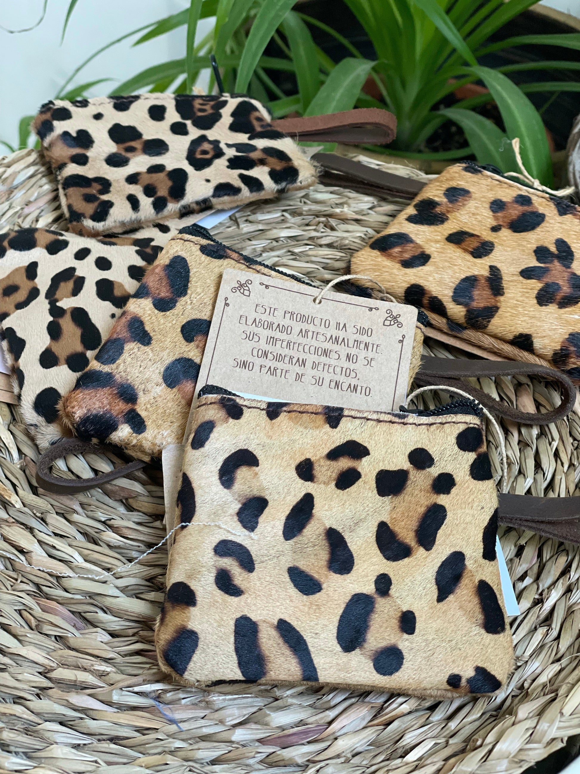 Monedero sencillo y práctico. Tejido imita pelaje animal. Cierre con cremallera.