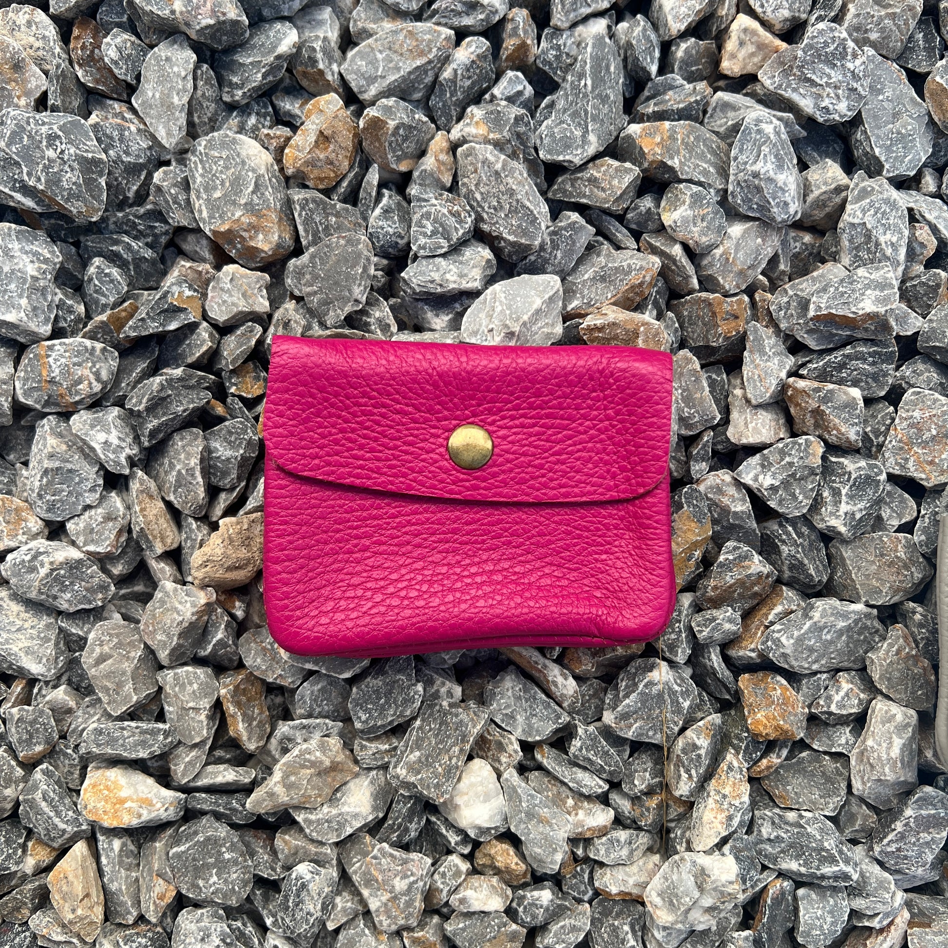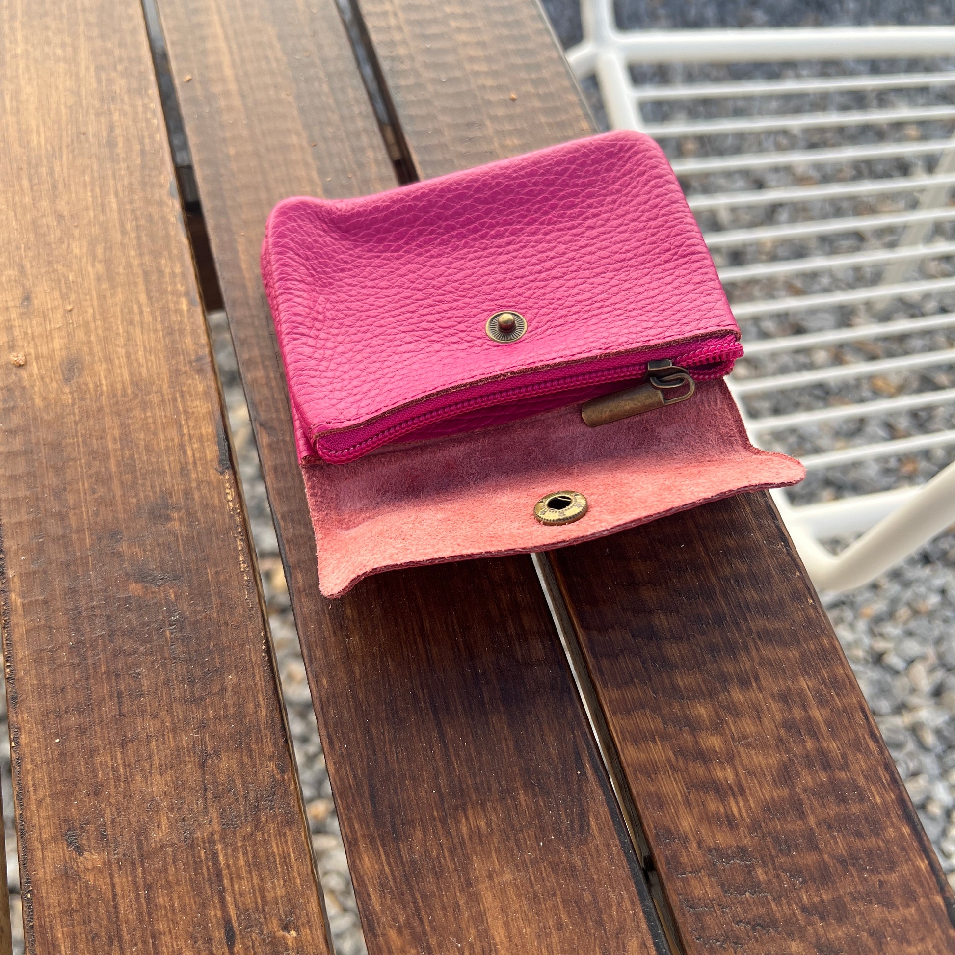 Monedero con textura en piel. Tres compartimentos interiores. Uno de ellos con cierre en cremallera. Interior sin forrar. Cierre exterior con broche en la solapa.