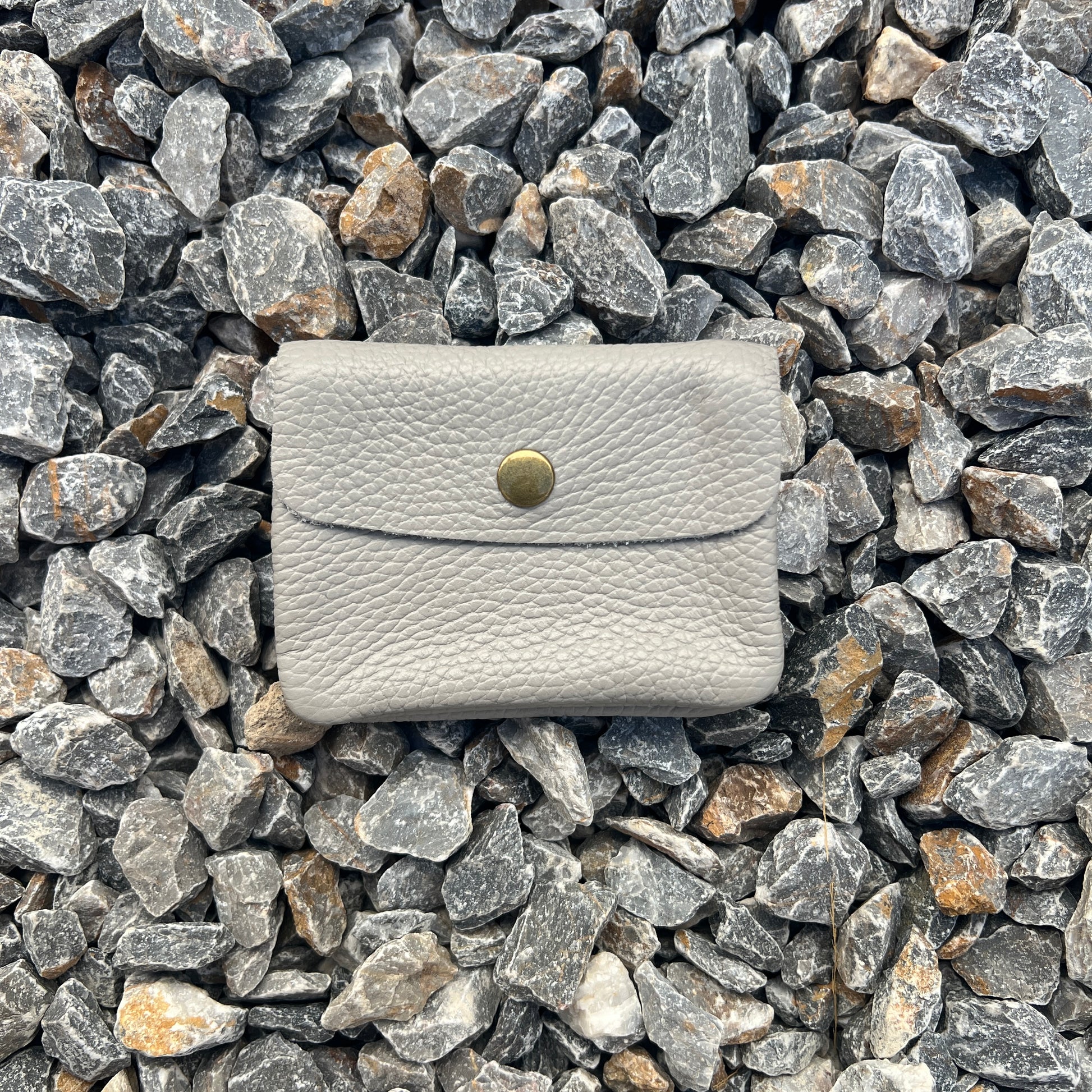 Monedero con textura en piel. Tres compartimentos interiores. Uno de ellos con cierre en cremallera. Interior sin forrar. Cierre exterior con broche en la solapa.