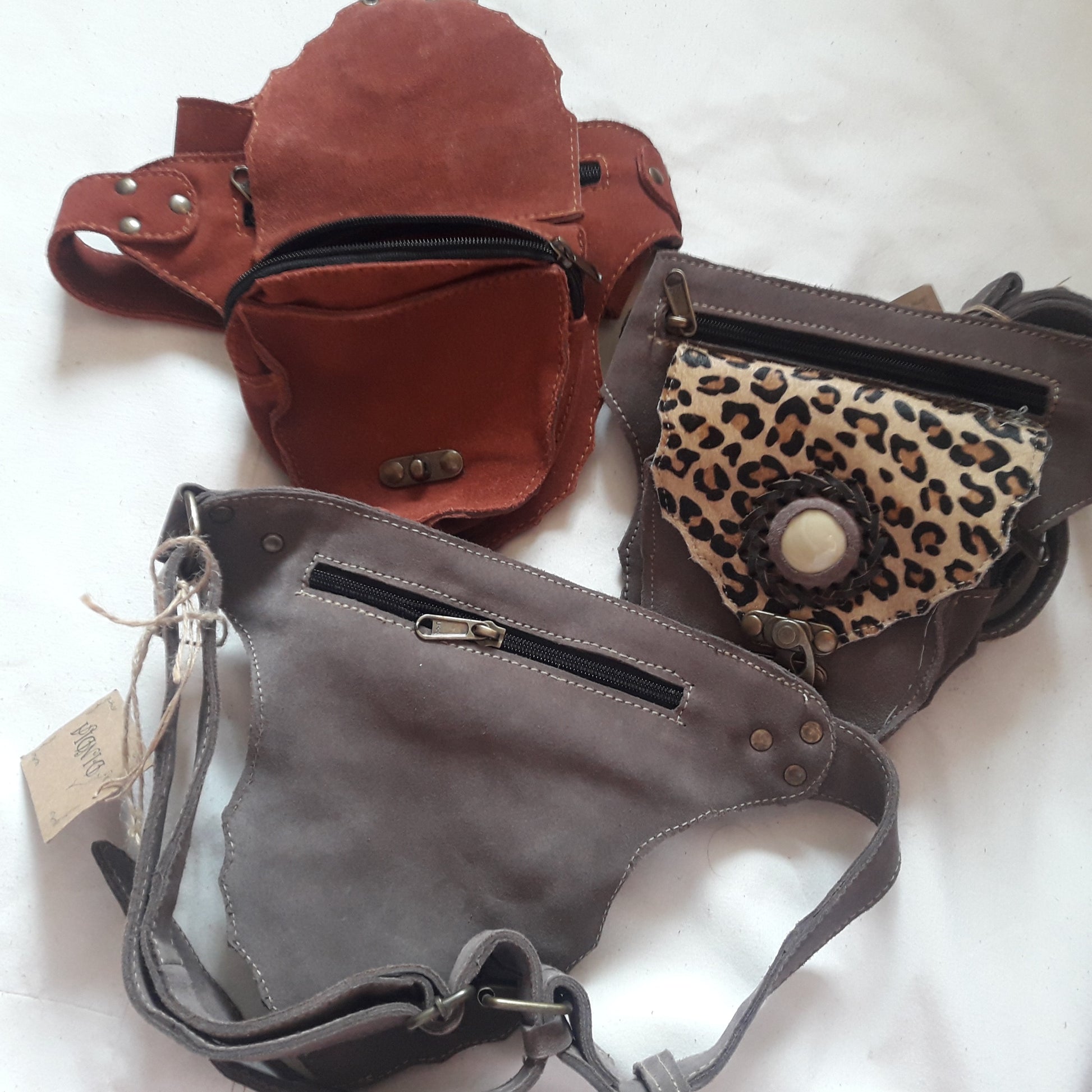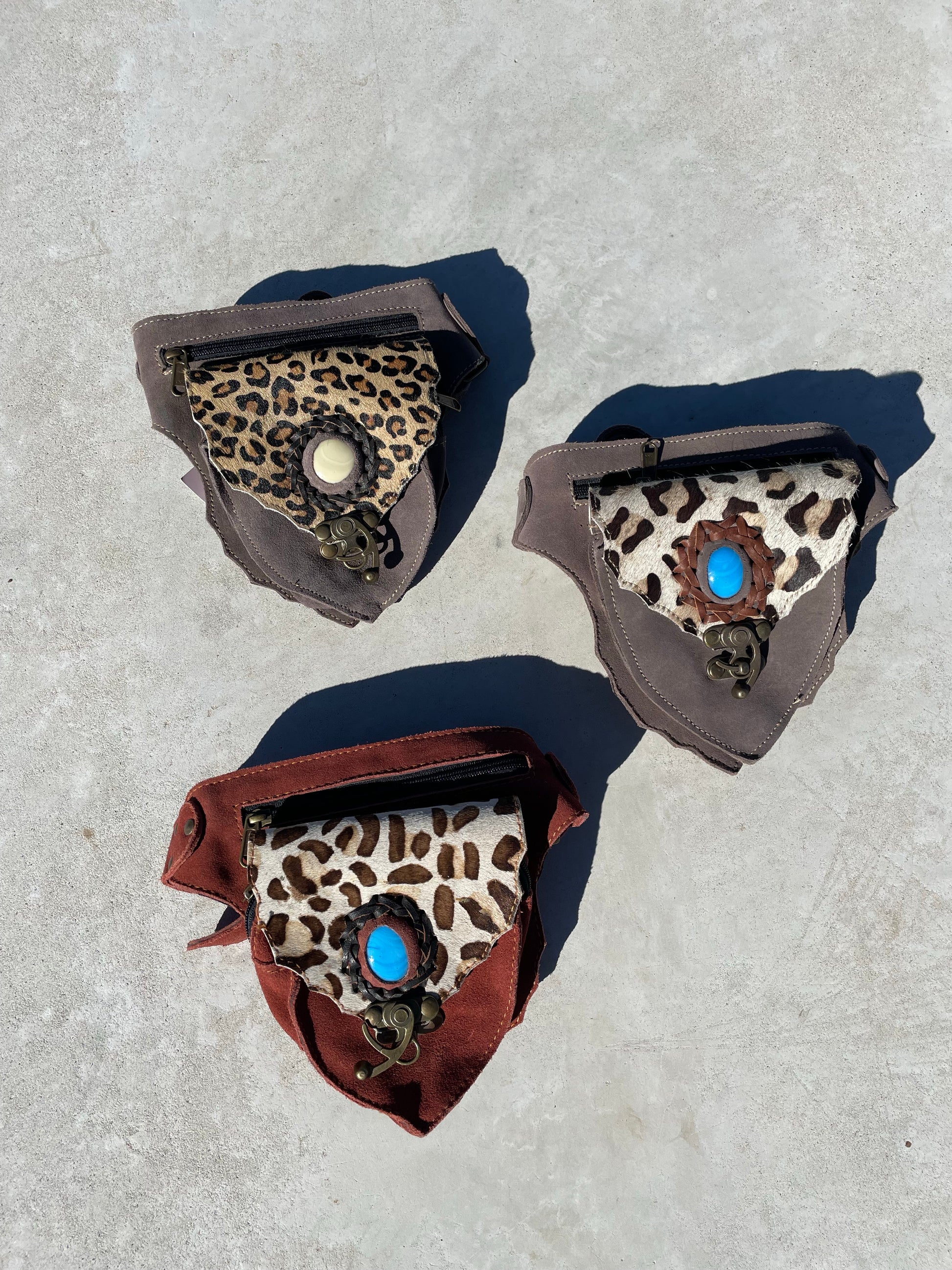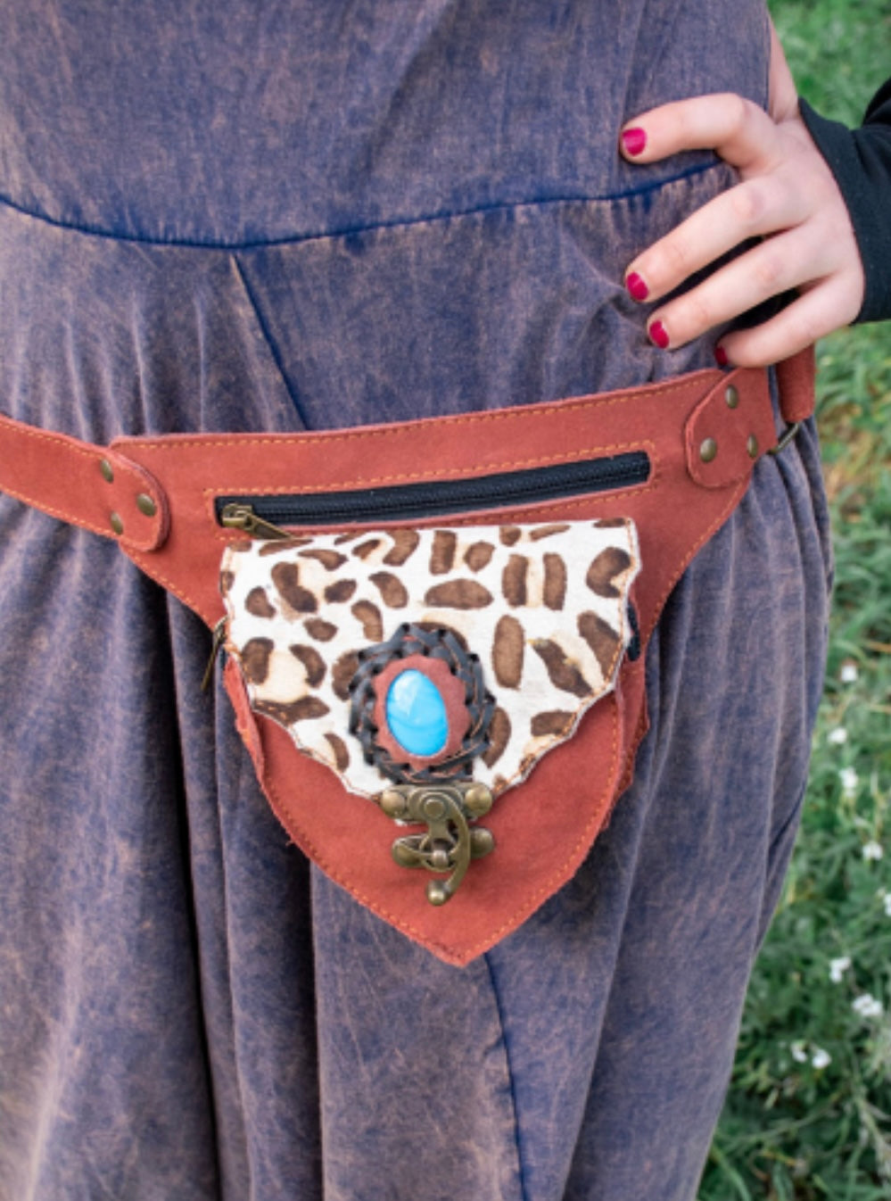 Forma triangular con un mineral. Dos bolsillos delanteros con cierre de cremallera y gancho metálico. Un bolsillo trasero con cierre de cremallera. Se puede ajustar con diferentes medidas a la cadera con hebilla.