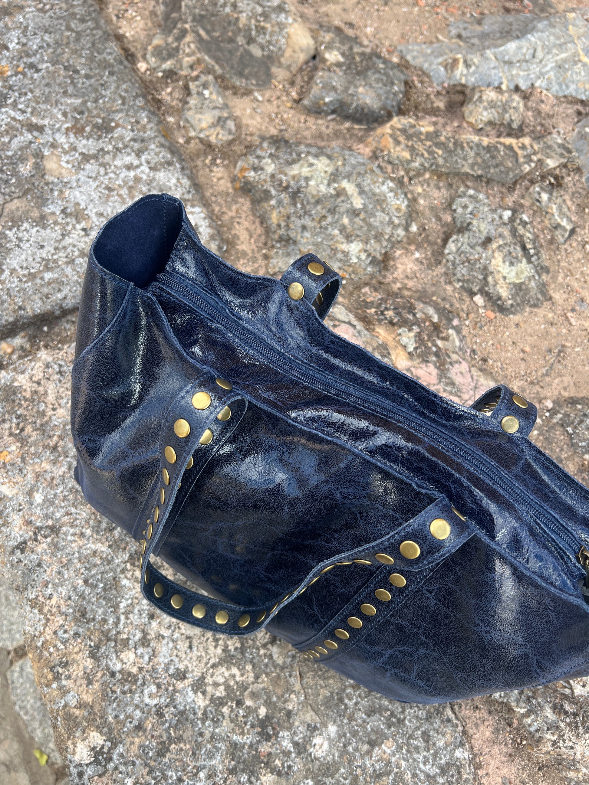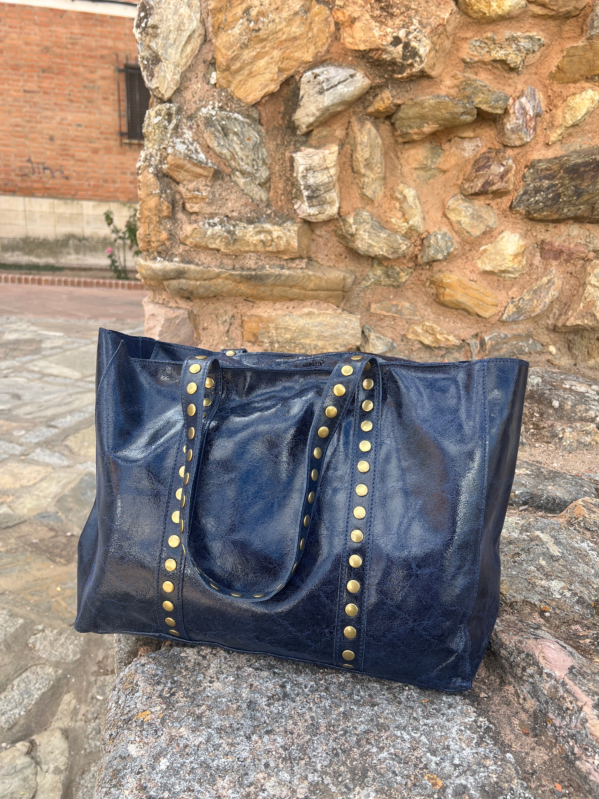 Bolso de hombro de piel con tachuelas. Tamaño grande. Interior sin forrar. Cierre mediante cremallera. Asas fijas para llevar al hombro.