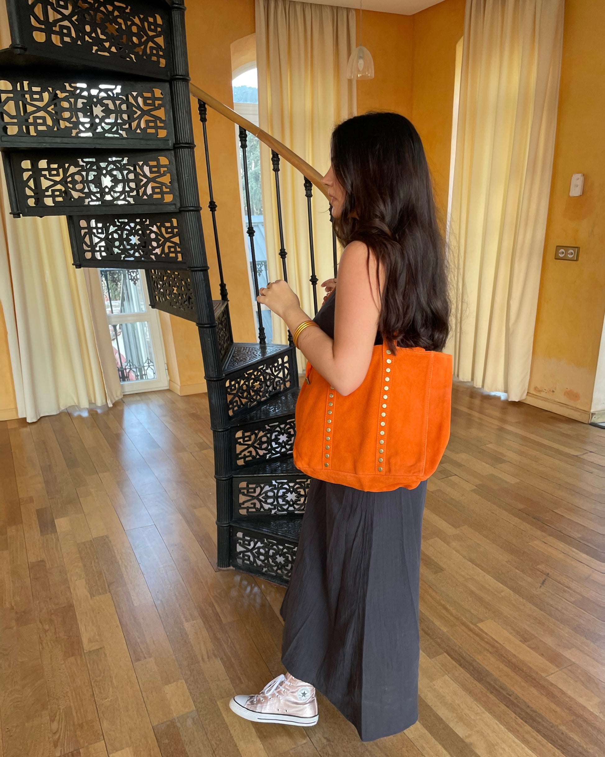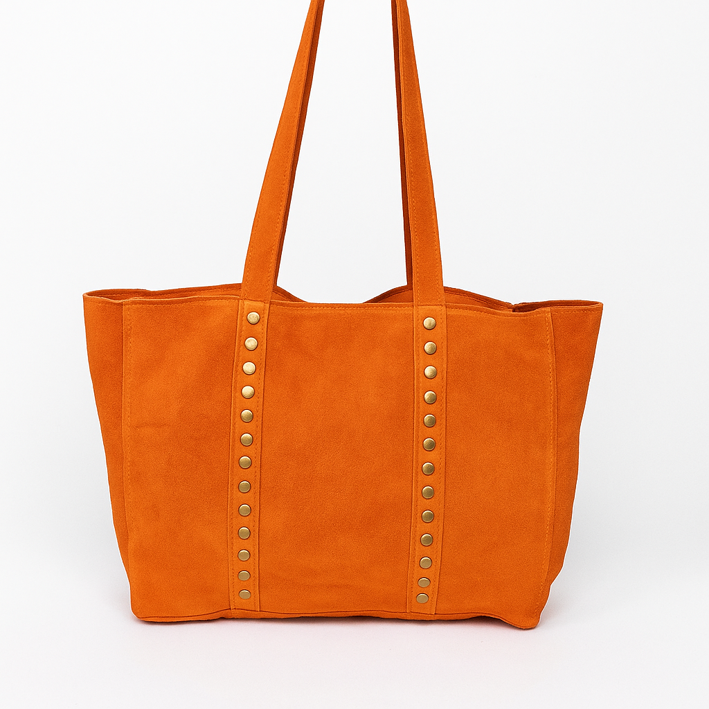 Bolso de hombro de piel de ante con tachuelas. Tamaño grande. Interior sin forrar. Cierre mediante cremallera. Asas fijas para llevar al hombro.