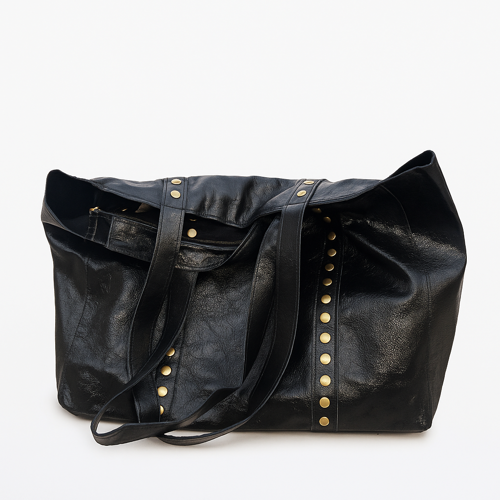 Bolso de hombro de piel con tachuelas. Tamaño grande. Interior sin forrar. Cierre mediante cremallera. Asas fijas para llevar al hombro.