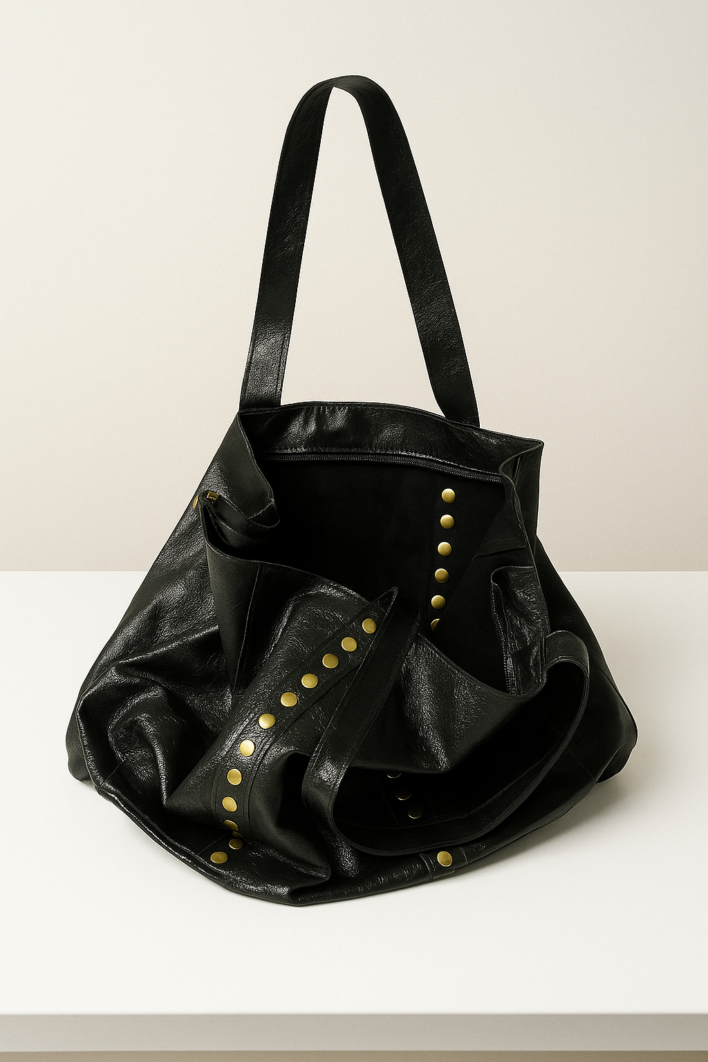 Bolso de hombro de piel con tachuelas. Tamaño grande. Interior sin forrar. Cierre mediante cremallera. Asas fijas para llevar al hombro.