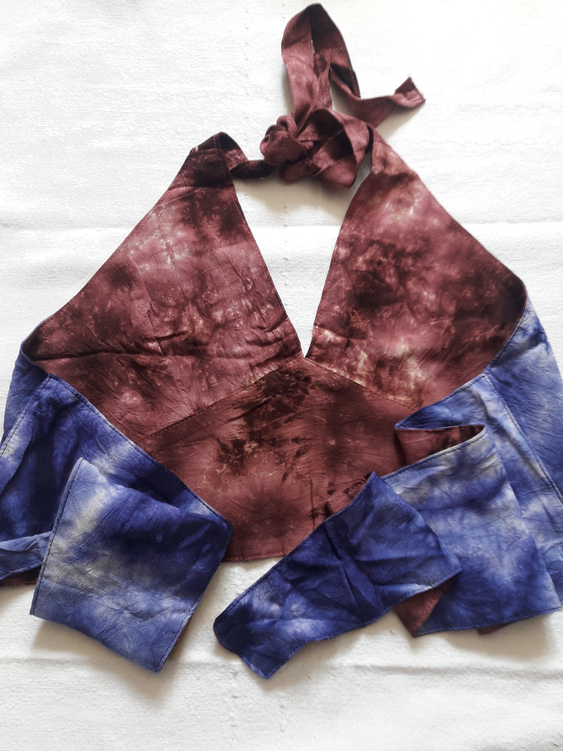 Top reversible. Escote pico. Espalda al aire. Anudado al cuello.