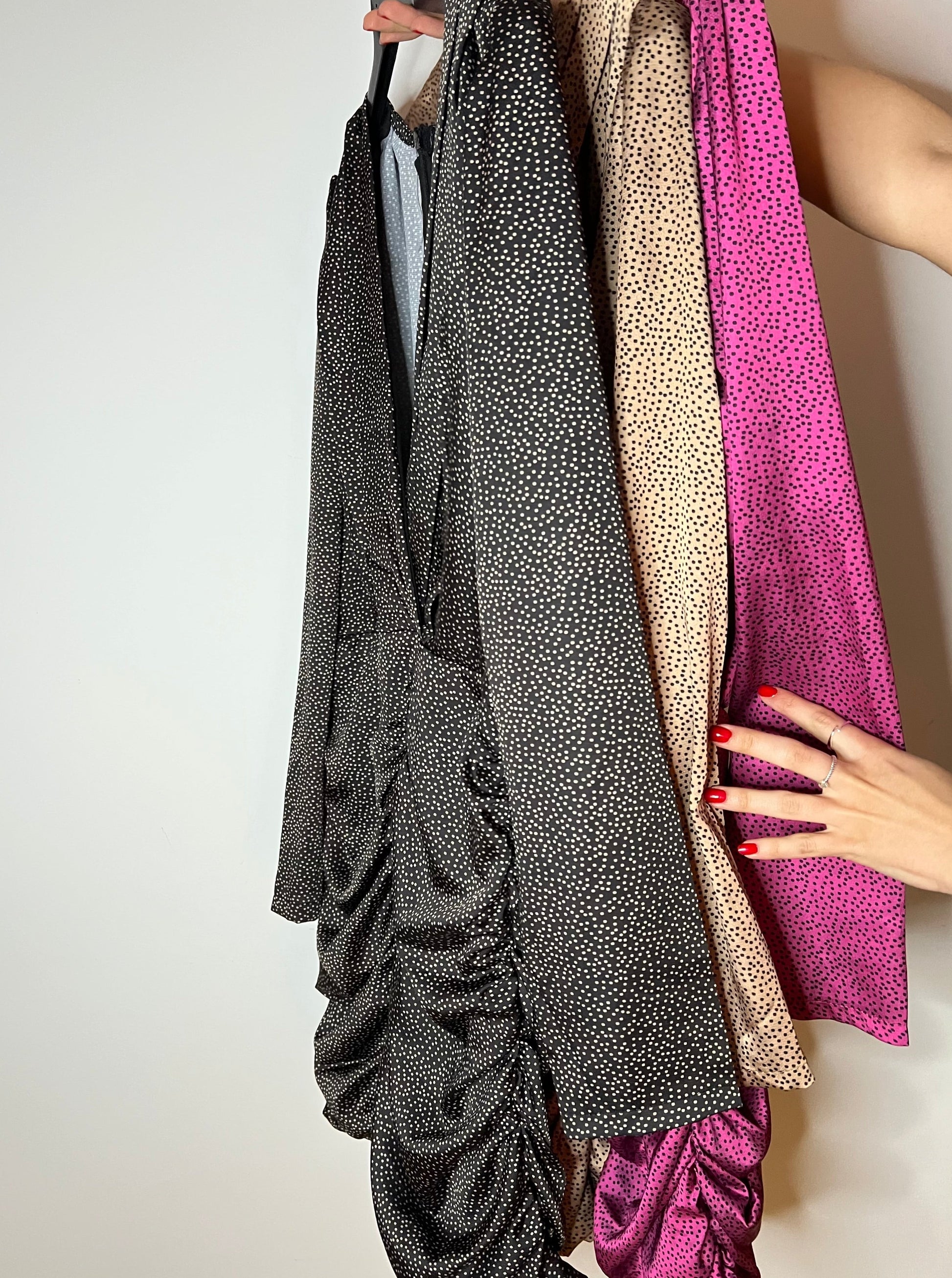 Vestido corto de escote de pico y manga larga. Detalle de frunces.