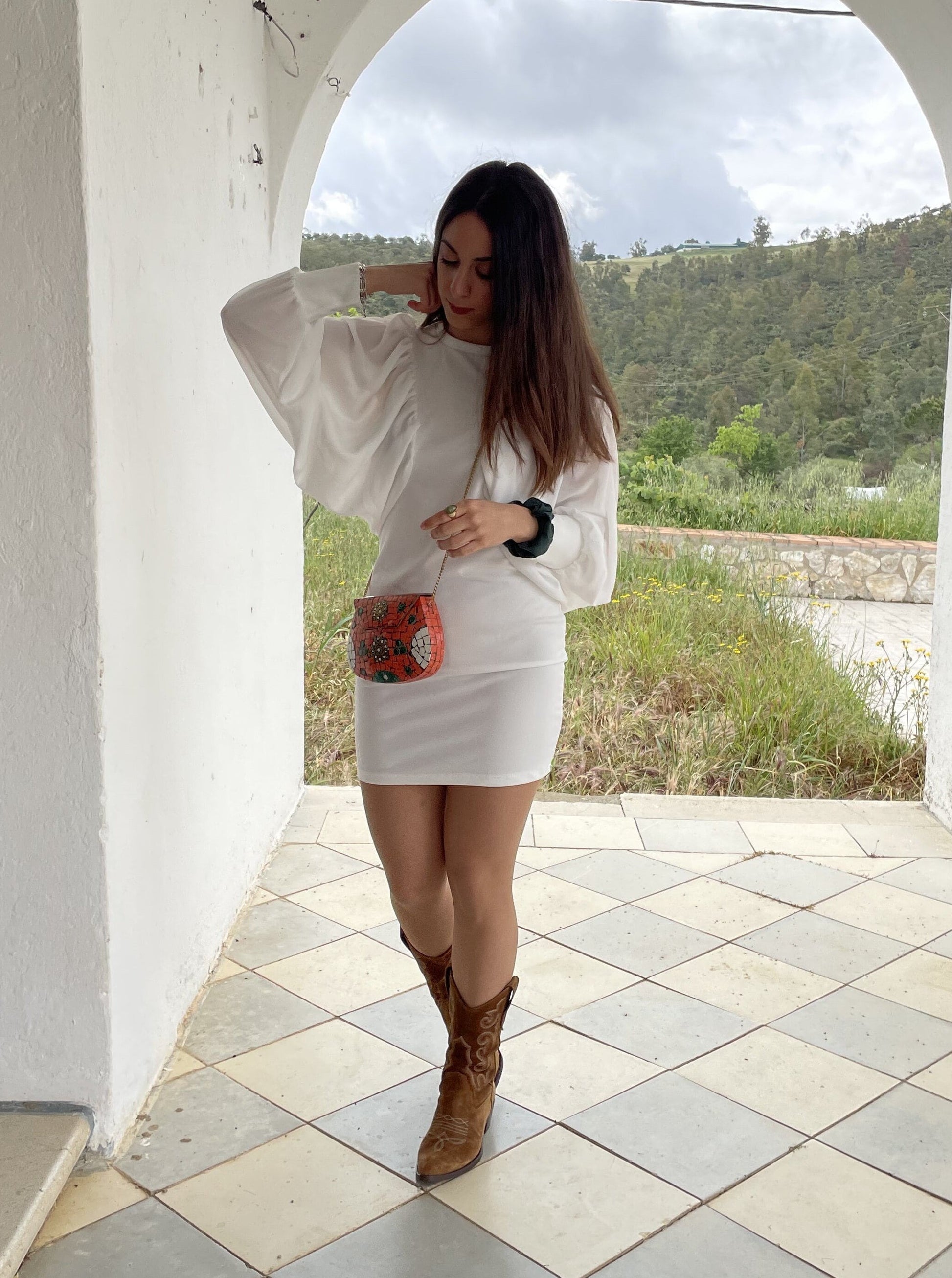 Vestido corto. Modelo ajustado. Cuello redondo. Manga larga en diseño englobado.